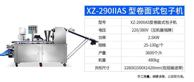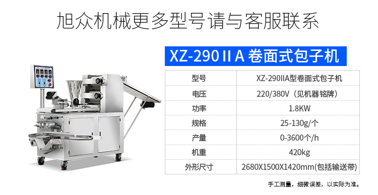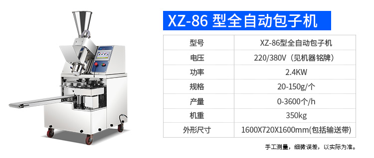 旭眾牌XZ-915全自動包子機體積小重量輕,外殼及接觸食品部分均由不銹鋼制造,外觀精美耐用;采用三變頻無極變速調控,生產性能穩定。設計先進,結構簡單,操作方便。包子機三大特色: