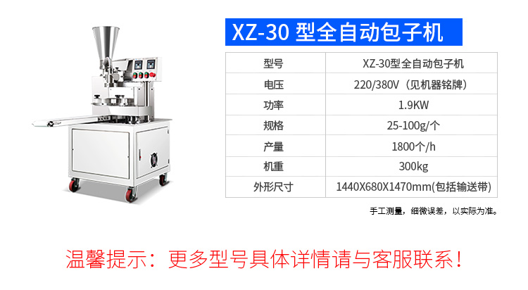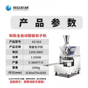 旭眾牌XZ-915全自動包子機體積小重量輕,外殼及接觸食品部分均由不銹鋼制造,外觀精美耐用;采用三變頻無極變速調控,生產性能穩定。設計先進,結構簡單,操作方便。包子機三大特色: