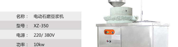 名稱XZ-350電動石磨豆漿機 電源220/380V 功率10kw 產量30kg/h 尺寸1000*550*1100mm 重量 規格 其他