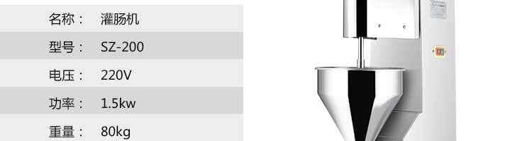 SZ-200灌腸機(jī),適合灌制各種香腸、紅腸、臘腸及糊狀制品。本機(jī)使用敞開式不銹鋼料斗,適用于連續(xù)添加物料;與灌裝手接觸部件全部采用優(yōu)質(zhì)不銹鋼制作以防生銹;該機(jī)自動貨程度高,技術(shù)先進(jìn)、性能穩(wěn)定、操作簡便、工作效率高,具有不破壞物料成份,保質(zhì)、保鮮等特點。