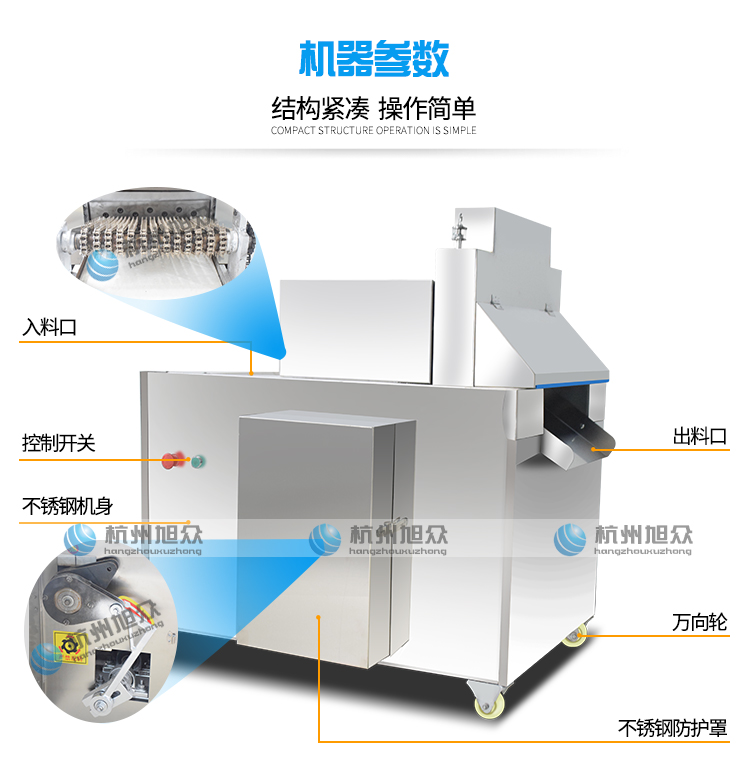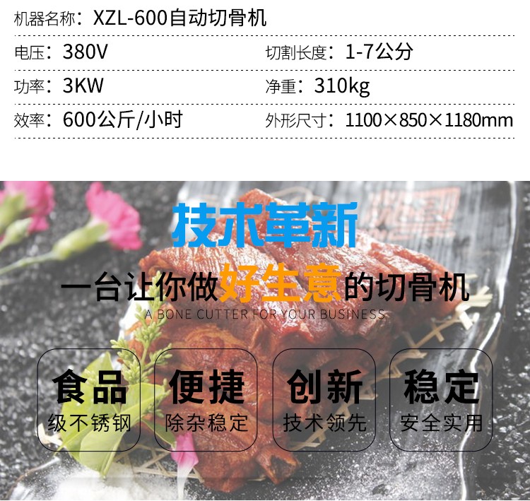 XZL-600自動(dòng)切骨機(jī)適用于小型食品加工廠、屠宰場(chǎng)、肉類加工廠、超市等單位使用。適用于中小型動(dòng)物骨頭,排骨,冷凍肉,凍雞、凍魚、鮮骨頭、鮮肉等加工設(shè)備。切骨機(jī)接觸食品的部位及外觀部位均采用不銹鋼或耐腐蝕材料制造,符合食品衛(wèi)生要求。本機(jī)設(shè)計(jì)合理,清洗方便,無損耗,采用特殊刀具切骨,不產(chǎn)生碎骨,較大程度保護(hù)了您的利益,且全自動(dòng)送料,操作簡(jiǎn)單,大大的減輕工人勞動(dòng)強(qiáng)度,提高了安全系數(shù)。不易會(huì)傷到手,具有效率高,能耗低,操作安全,外形美觀等特點(diǎn)。