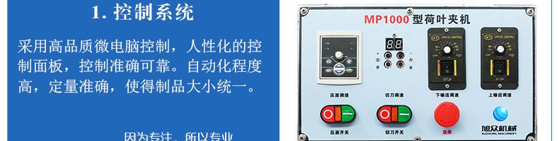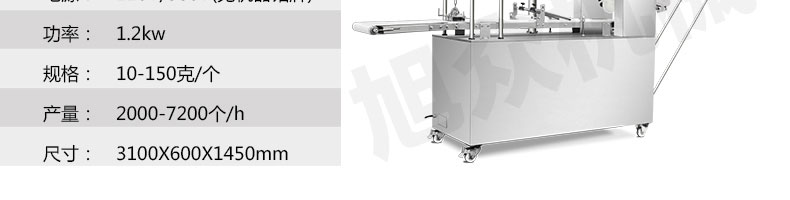 名稱MP1000荷葉夾機 電源220/380V(見機器名牌) 功率1.2kw 產量2000-7200個/小時 尺寸3100*600*1450mm 重量380kg 規格10-150克/個 其他