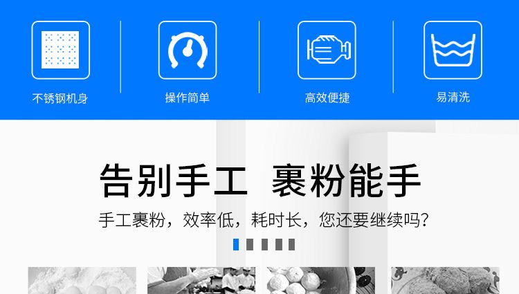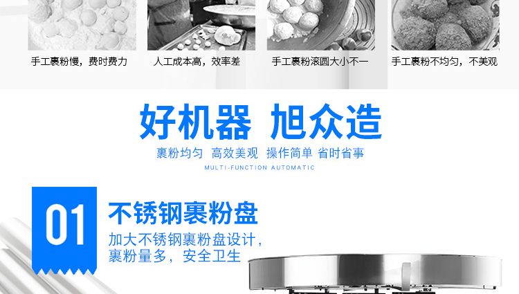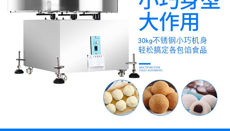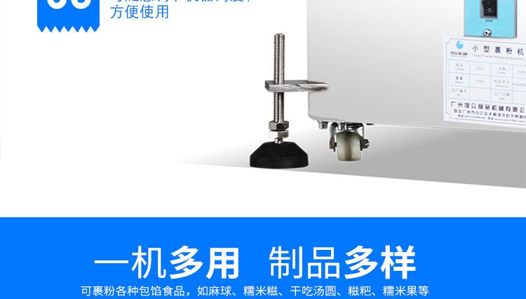 小型裹粉機用于裹芝麻、麻薯、糯米糍、干吃湯圓等熟糯米制品裹粉滾圓。