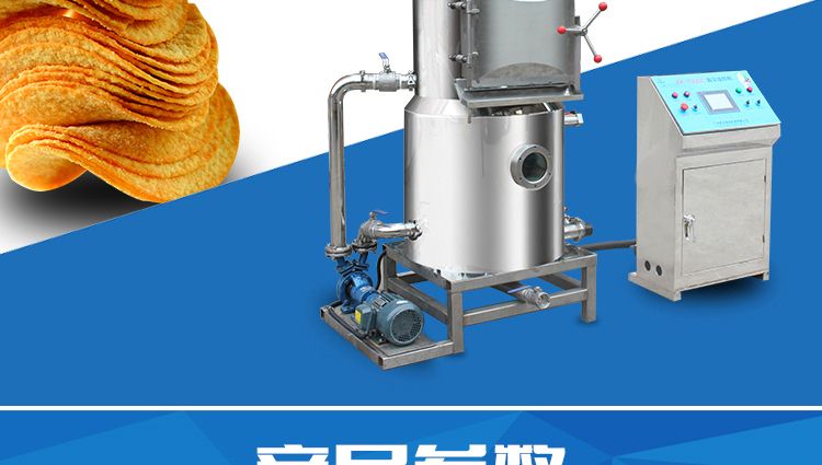 ●雙室采用上下兩個罐,脫油時確保無回油,使含油、含水率低。油炸、脫油、脫水、油過濾一體化設計,在真空下連續性完成,產品含油量低,產品處于負壓狀態,在這種相對缺氧的條件下進行食品加工,可以減輕甚至避免氧化作用(例如脂肪酸敗、酶促褐變和其他氧化變質等)所帶來的危害。在負壓狀態,以油作為傳熱媒介,食品內部的水分(自由水和部分結合水)會急劇蒸發而噴出,使組織形成疏松多孔的結構。