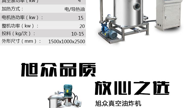 名稱ZK-500真空油炸機 電源380V 功率5.5/1.1kw 產量5-15kg/次 尺寸1400*1400*2500mm 重量 規格料框數量1組;加熱方式:電/導熱油 其他